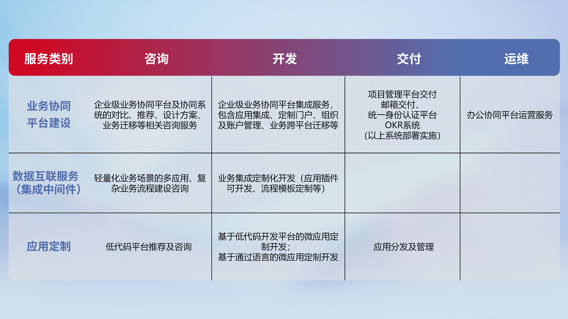 针对钉钉、、、企微、、、、IDaas等平台级产品提供产品的规划、、、、方案、、交付、、、定制化开发等服务,,,,实现如统一协同办公、、智能客户服务、、混合会议管理、、、智能数据查询、、等业务场景,,,,实现数字化转型。。。