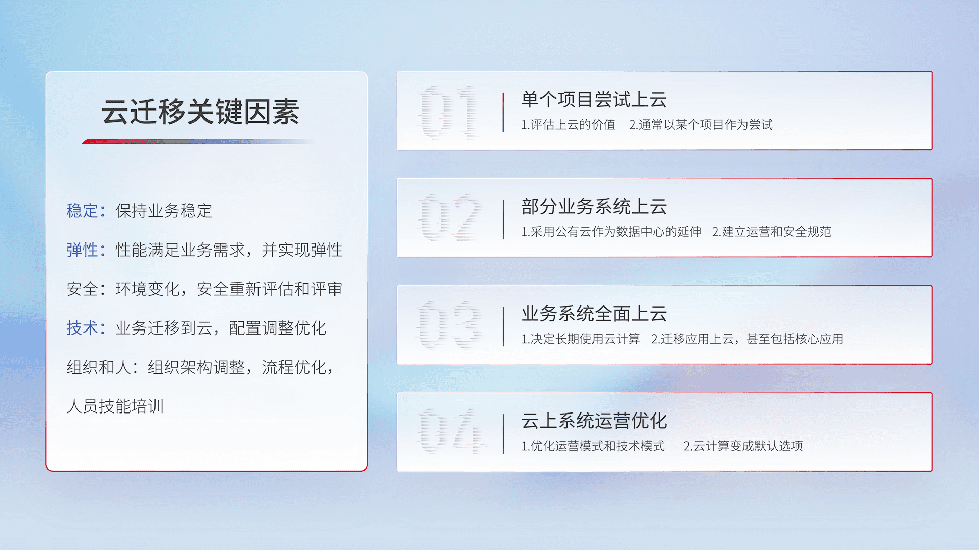 结合实际业务,,,,从规划设计、、、云平台选型、、、云原生改造、、数据迁移、、集成交付,,迁移全过程为客户识别最佳上云路径,,做好风险识别管理,,,设计网络架构、、身份权限、、、安全审计合规、、、、操作审计、、、日志审计、、、监控告警策略、、多站点容灾设计等,,对云上基础设施进行整体规划,,,,提升IT治理水平,,以满足弹性、、、高可用、、高性能的需求。。。
