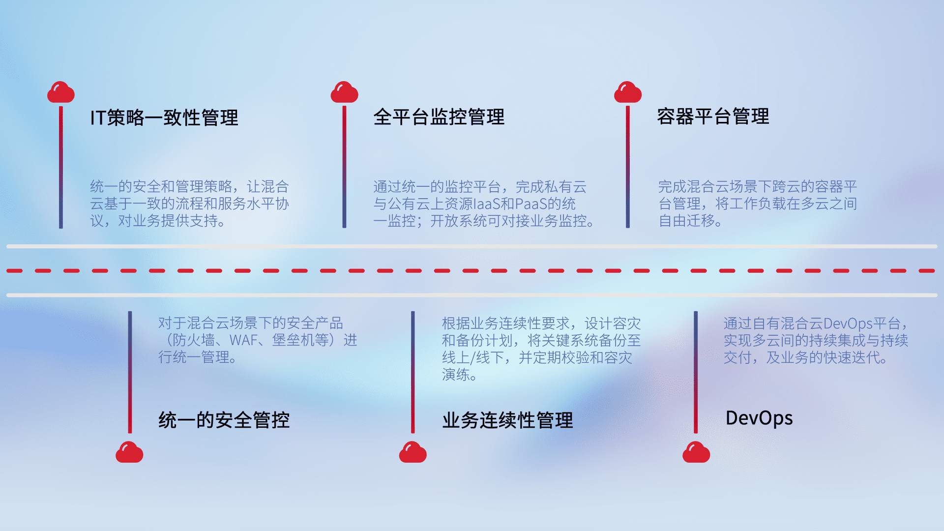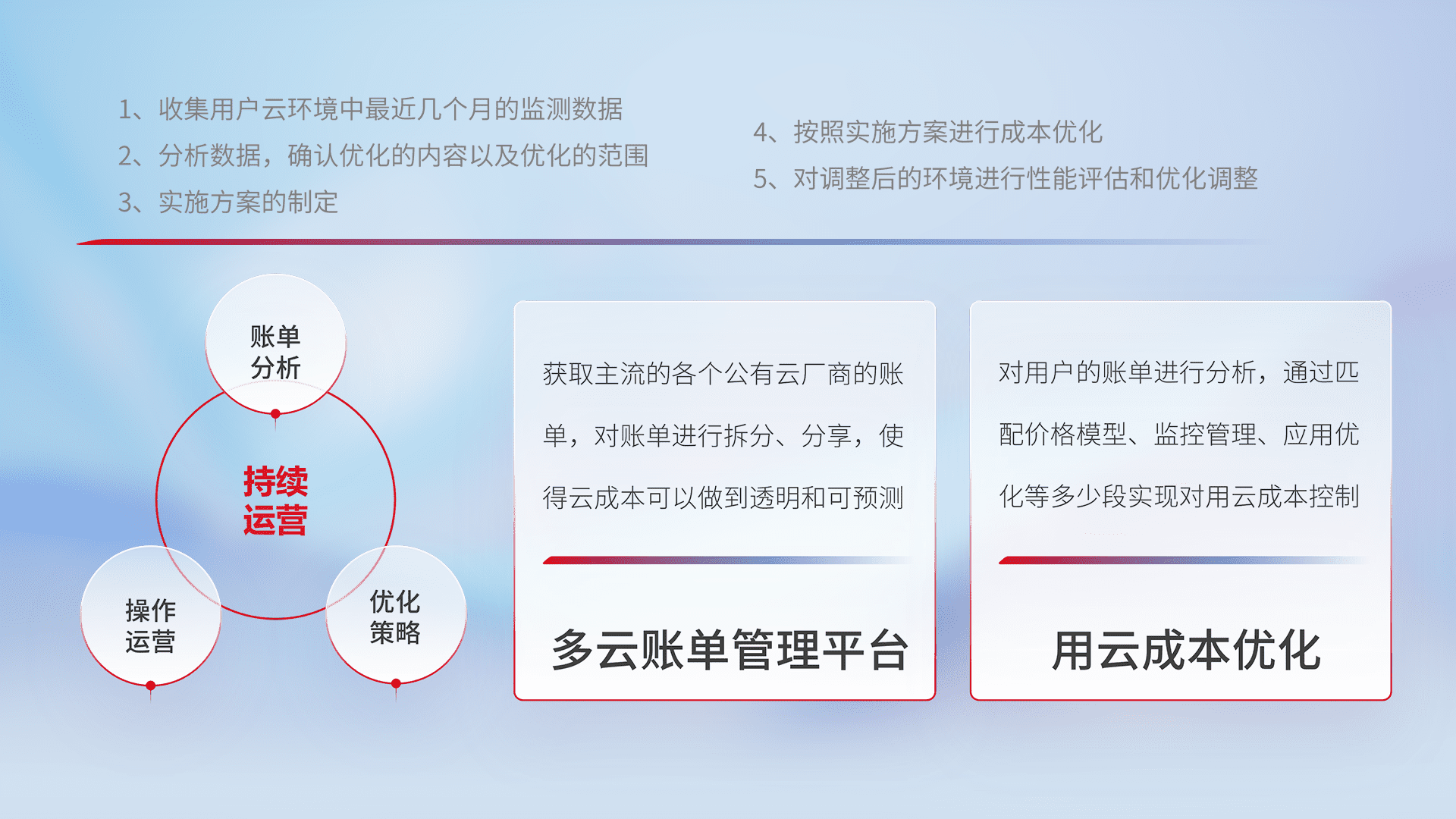 通过多云纳管,,,以统一的资源数据模型把客户的云资源进行抽象和封装,,进而实现对多云资源的统一操作,,,保障云资源管理的可靠性、、稳定性与可用性。。。量身定制化运维内容,,,配置、、、、开发运维、、补丁管理、、备份、、、监控、、认证和访问管理、、、、审计和日常巡检等,,,保障在用云过程中的可靠度,,,,稳定度以及高可用率。。。。