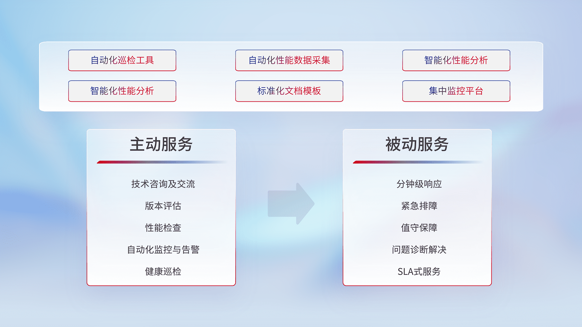 智能化工具和标准化文档,,保障服务质量,,提供主动服务(包含技术咨询、、、版本评估、、性能检查、、自动化监控与告警、、、、健康巡检)和被动服务包含(分钟级响应、、、紧急排障、、、、值守保障、、问题诊断解决、、SLA服务)。。。。
